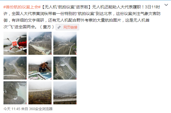 中国证券网讯 据新华社中国网事微博3日消息,上午11时许,全国人大代表黄润秋带着一份特别的“航拍议案”到达北京,这份议案关注气象灾害防御,有详细的文字调研,还有无人机配合野外考察的大量航拍图片,这是无人机首次“飞”进全国两会。