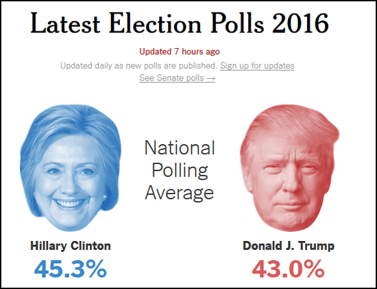 纽约时报的数据相对比较接近,希拉里仅仅领先2.3%。