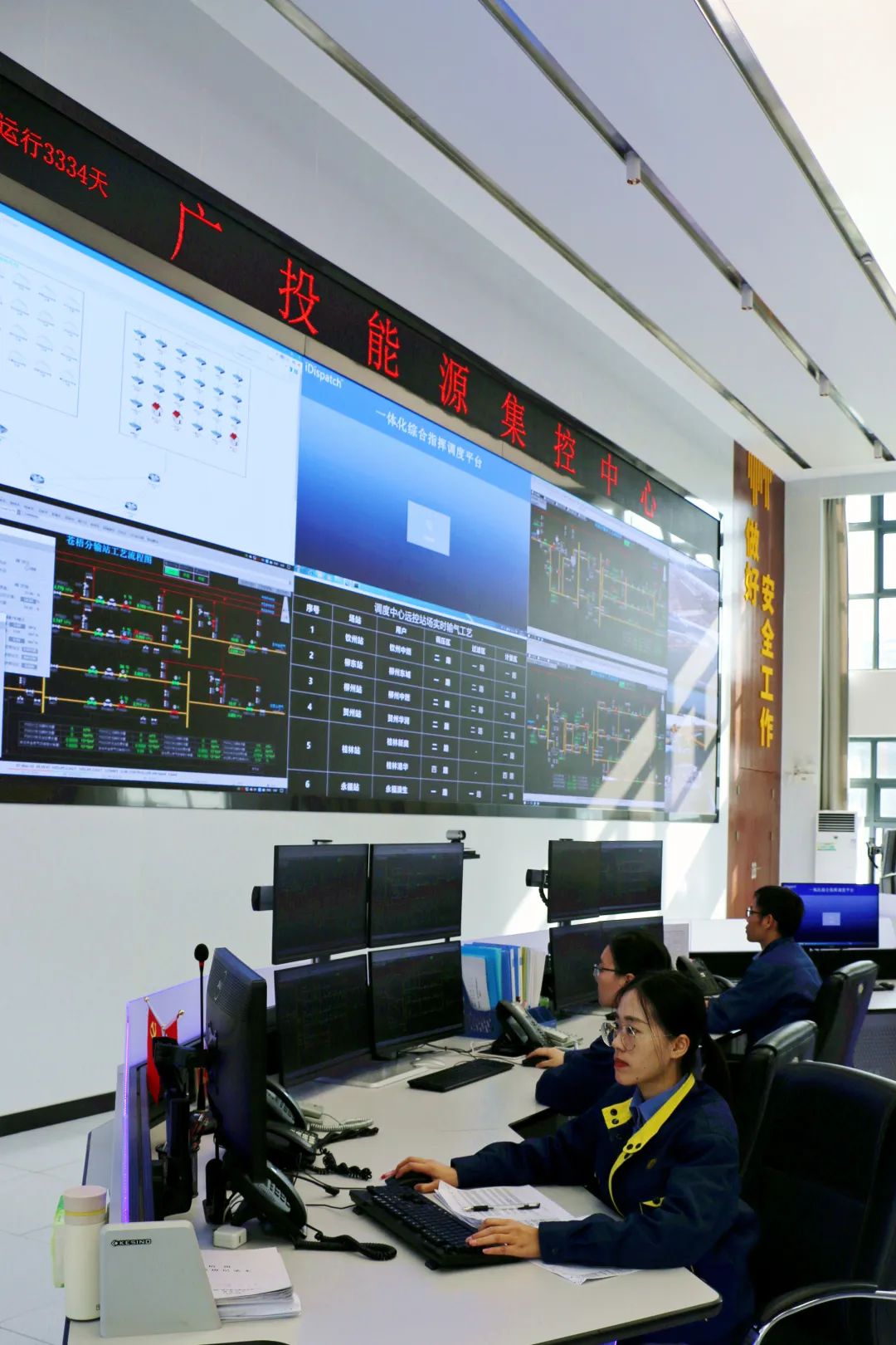 为满足多元供气、统一调度的需要,广投管网公司以区内首创、国内领先为目标,精心打造广西天然气调控中心。该调控中心把生产数据采集监控系统、大数据监测平台、工业电视监视系统、管道GPS巡检管理系统、管道三维实景模型、视频会议系统等集成在一起,形成一个高效的智能化管理系统。其中,生产数据采集监控系统和大数据监测平台能实时显示区内不同地市分输站压力、温度、瞬时流量等重点数据,可实现各分输站调度集中控制、管道管存利用配置、工艺优化、日指定量分输率监控、紧急切断等功能;工业电视监视系统能全天候监控分输站内生产运行、作业安全、第三方施工等基本情况;管道GPS巡检管理系统、三维实景模型能将管道走向、沿线地形地貌等信息直观地呈现在眼前,便于对管道巡护动态进行监管、排查风险隐患。目前,公司已完成22座投产分输站接入调控中心的工作,可对广西区内中游天然气管网进行集中监控和统一输配管理,确保输气生产工作有序平稳。