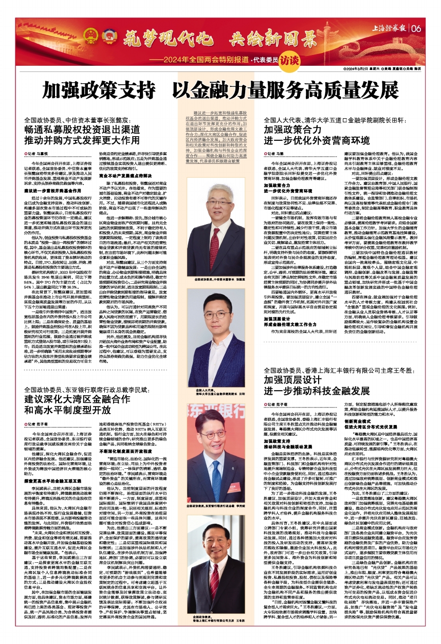 建议进一步拓宽和畅通私募股权基金的退出渠道,推动并购方式在退出环节发挥更充分的作用;加强顶层设计,形成金融伦理文教工作合力;深化大湾区金融合作,促进区内经济融合发展;加大政府资金和相关政策对科技创新和转型的支持,加强金融机构与科技企业的深度合作……围绕金融如何助力高质量发展,代表委员积极建言献策