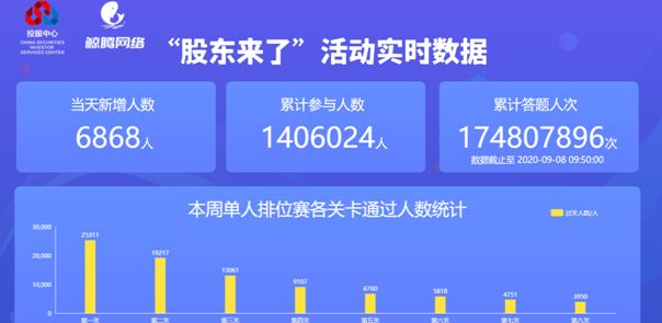 《股东来了》2020投资者权益知识竞赛正如火如荼开展中,自2020年8月10日下午3:30答题游戏正式上线,注册参赛人数突破100万,达140万;累计答题人次超1亿,达到1.7亿,双双创造历史新高。