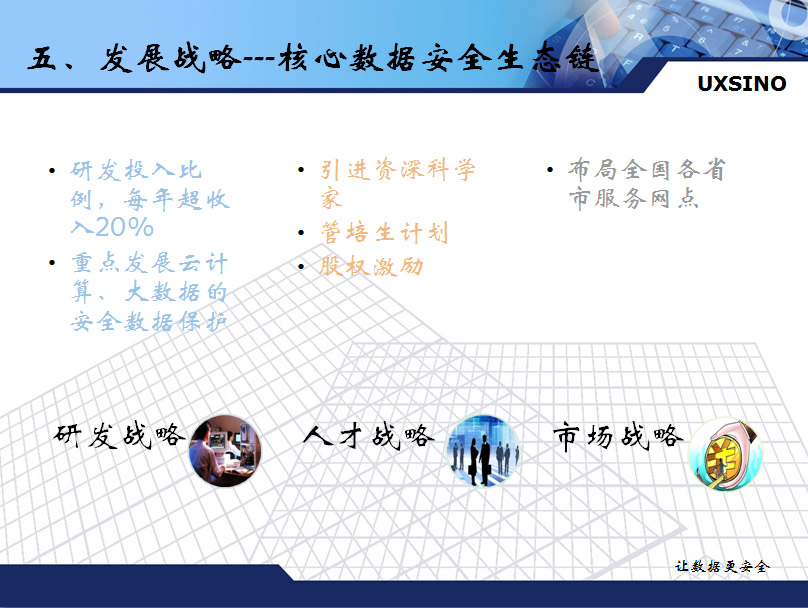 公司以核心数据安全驱动提供整体解决方案,让数据更安全。银行和电力是主要客户。公司未来3-5年的目标要做到5-10个亿营业收入。公司核心理念优势,发展前景广阔。2019年金融行业75%要去掉IOE,为公司提供巨大发展空间。同时,公司营收与利润保持平稳增长。近五年收入和利润保持每年30%-50%持续增长。