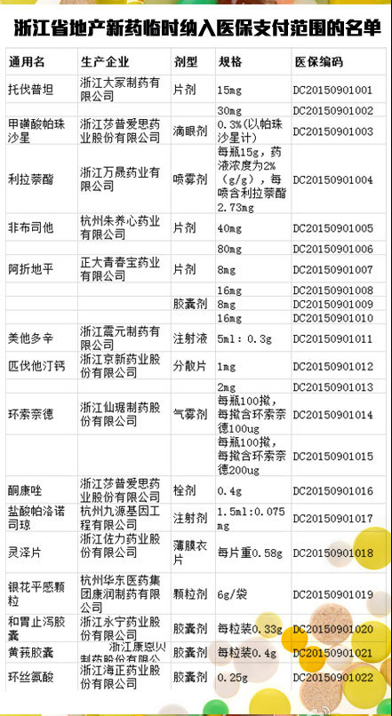 中国证券网讯 10月13日从浙江发布微博获悉,为鼓励本省医药企业自主创新,保障参保人员用药权益,经公开申报和审核,将15种药品临时纳入浙江省医保支付范围,按基本医疗保险乙类药品的有关规定执行,个人自理比例为3%。其中华东医药等多家上市公司相关药品在列。