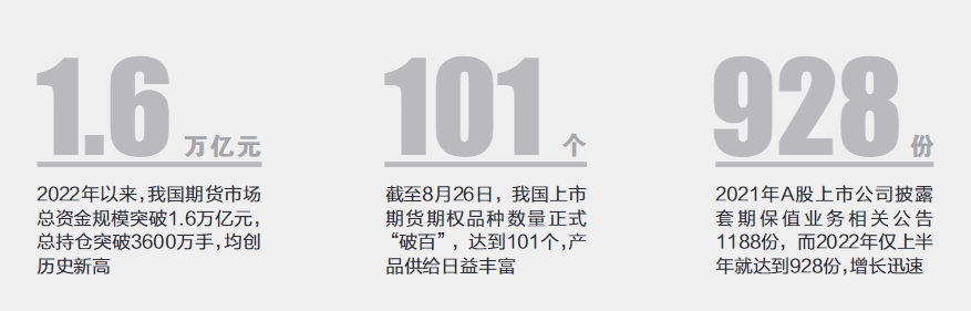 2022年以来,我国期货市场总资金规模突破1.6万亿元,总持仓突破3600万手,均创历史新高。截至昨日,我国上市期货期权品种数量正式“破百”,达到101个,产品供给日益丰富。
