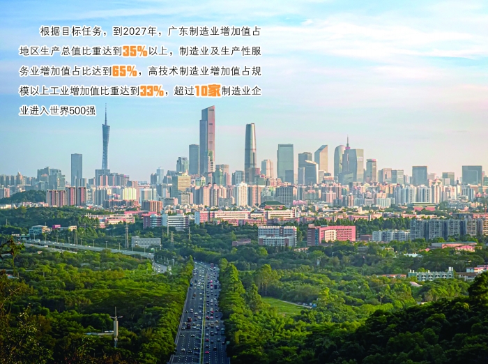 《意见》提出22条具体举措。根据目标任务,到2027年,广东制造业增加值占地区生产总值比重达到35%以上,制造业及生产性服务业增加值占比达到65%,高技术制造业增加值占规模以上工业增加值比重达到33%,工业投资年均同比新增超过1000亿元,培育形成10个以上产值超万亿元的战略性产业集群,超过10家制造业企业进入世界500强。