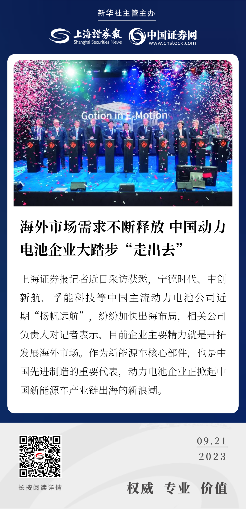 上海证券报记者近日采访获悉,宁德时代、中创新航、孚能科技等中国主流动力电池公司近期“扬帆远航”,纷纷加快出海布局,相关公司负责人对记者表示,目前企业主要精力就是开拓发展海外市场。作为新能源车核心部件,也是中国先进制造的重要代表,动力电池企业正掀起中国新能源车产业链出海的新浪潮。