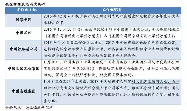 2017年,七大垄断领域央企领导层纷纷表态混改决心,发布企业混改方案。2017 年“混改”将在电力、铁路、石油、天然气、民航、军工、电信等这七大行业中持续性突破。