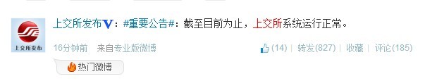 上交所称该所今日交易系统运行正常,已达成的交易将进入正常清算交收环节。