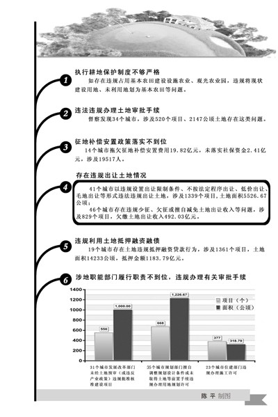 土地督察也发现,地方一些市、县政府主导的违法违规行为屡禁不止,当前土地管理面临的形势依然比较严峻。2013年例行督察共发现地方政府在土地利用和管理方面存在2.38万个问题,涉及土地面积20.12万公顷。主要包括6类问题:一是部分地方政府执行耕地保护制度不够严格;二是部分地方政府违法违规办理土地审批手续;三是部分地方政府征地补偿安置政策落实不到位,侵害被征地农民合法权益;四是一些地方政府存在违规出让土地情况;五是一些地方违规利用土地抵押融资融债;六是一些地方政府涉地职能部门履行职责不到位,违规办理有关审批手续。