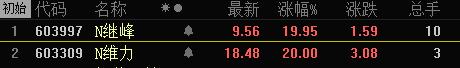开盘,N继峰无悬念顶格秒停,N维力遭临停。截至发稿,N继峰上涨44.04%,报11.48元,N维力上涨20%,报18.48元。
