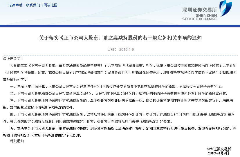 今日早些时候,上交所网站刚发布关于落实《上市公司大股东、董监高减持股份的若干规定》相关事项的通知。《通知》亦称,自2016年1月9日起,上市公司大股东此后任意连续3个月内通过证券交易所集中竞价交易减持股份的总数,不得超过公司股份总数的1%;上市公司大股东通过协议转让方式减持股份的,单个受让方的受让比例不得低于5%,转让价格范围下限比照大宗交易的规定执行。