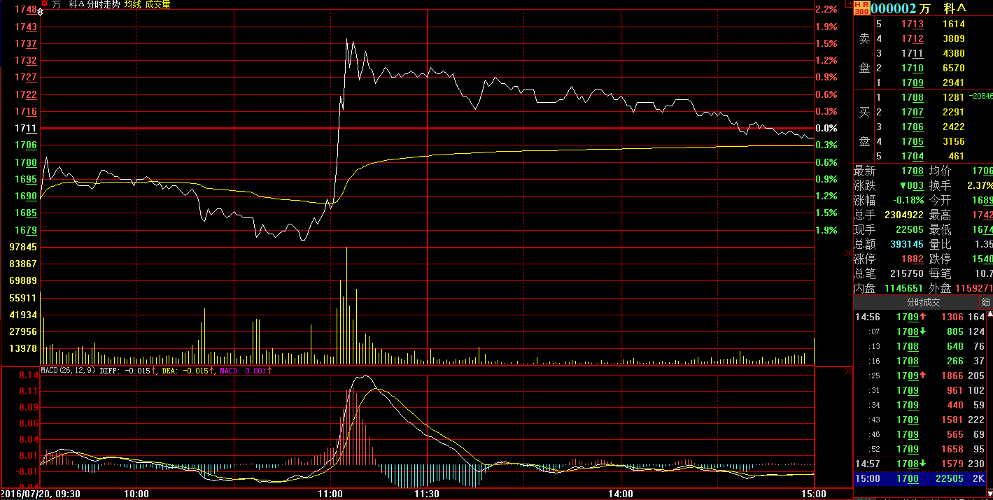 中国证券网讯 今日万科A股价临近午盘突然拉升,盘中从下跌逾2%一度拉升至上涨近2%,午后有所回落,小幅收跌。截至收盘,万科A收报于17.08元,下跌0.18%,成交金额近40亿元。