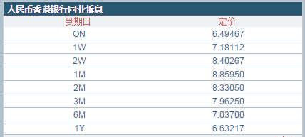 中国证券网讯 据香港财资市场公会定价,离岸人民币香港银行同业拆息利率(CNY Hibor)今日(21日)全线下跌。其中,离岸人民币1个月期Hibor下跌143个基点,至8.86%;离岸人民币3个月期Hibor下跌86个基点至7.96%,结束连日上涨。