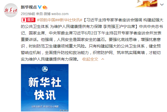 中共中央总书记、国家主席、中央军委主席习近平6月2日下午主持召开专家学者座谈会并发表重要讲话。他强调,人民安全是国家安全的基石。要强化底线思维,增强忧患意识,时刻防范卫生健康领域重大风险。只有构建起强大的公共卫生体系,健全预警响应机制,全面提升防控和救治能力,织密防护网、筑牢筑实隔离墙,才能切实为维护人民健康提供有力保障。