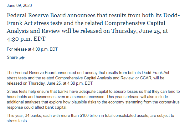 预告:美联储将于北京时间6月26日凌晨发布压力测试结果