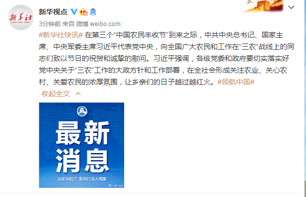 在第三个“中国农民丰收节”到来之际,中共中央总书记、国家主席、中央军委主席习近平代表党中央,向全国广大农民和工作在“三农”战线上的同志们致以节日的祝贺和诚挚的慰问。习近平强调,各级党委和政府要切实落实好党中央关于“三农”工作的大政方针和工作部署,在全社会形成关注农业、关心农村、关爱农民的浓厚氛围,让乡亲们的日子越过越红火。