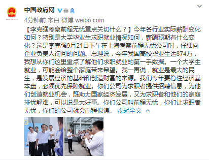 今年各行业实际薪酬变化如何?特别是大学毕业生求职就业情况如何,薪酬预期有什么变化?这是李克强9月21日下午在上海考察前程无忧公司时,仔细向企业负责人询问的问题。总理说,今年我国高校毕业生达874万,我想从你们这里重点了解他们求职就业的第一手数据。一个大学生就业,可能会给整个家庭带来希望。我一再说,就业是最大的民生,是发展经济的基础和创造财富的来源。我们今年要稳住经济基本盘,必须优先保障就业。你们公司为求职者提供招聘信息,为他们创造就业机会,既助力国家经济发展,又为求职者和他们的家庭排忧解难,可以说是大好事。你们公司叫前程无忧,你们让求职者无忧,你们的公司就会前程似锦。