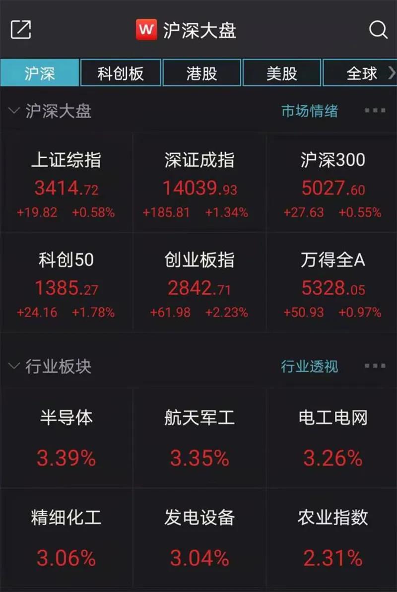 今日早盘,A股走出令人振奋的行情。截至午间收盘,上证指数涨0.58%,报3414.72点;深证成指涨1.34%,报14039.93点;创业板指涨2.23%,报2842.71点。超2900只个股早盘上涨。