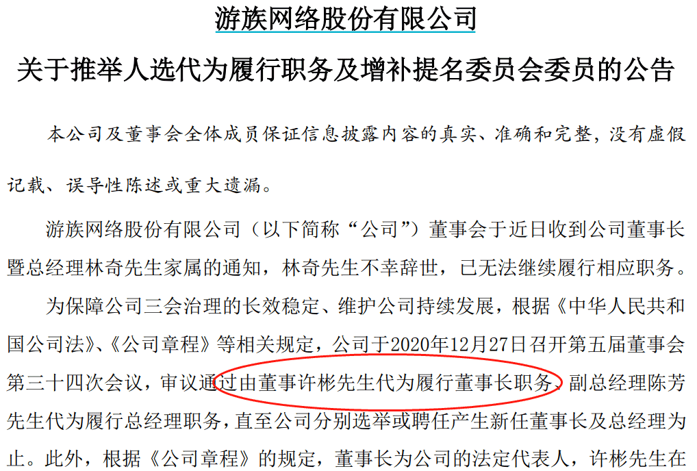 28日早盘,游族网络公告称,公司董事许彬代为履行董事长职务,副总经理陈芳代为履行总经理职务,直至公司分别选举或聘任产生新任董事长及总经理为止。