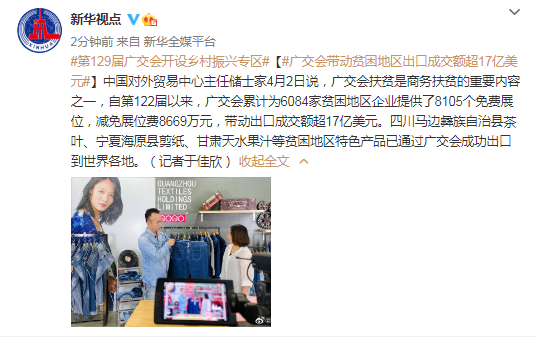 广交会带动贫困地区出口成交额超17亿美元