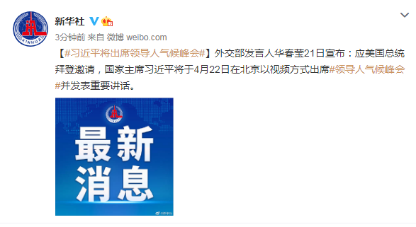 外交部发言人华春莹21日宣布:应美国总统拜登邀请,国家主席习近平将于4月22日在北京以视频方式出席领导人气候峰会并发表重要讲话。