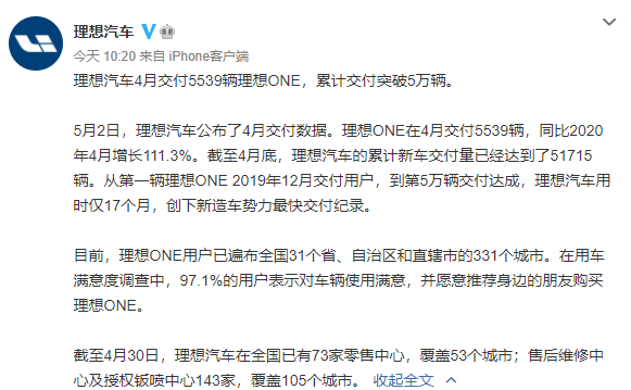 理想汽车4月交付5539辆理想ONE 累计交付突破5万辆