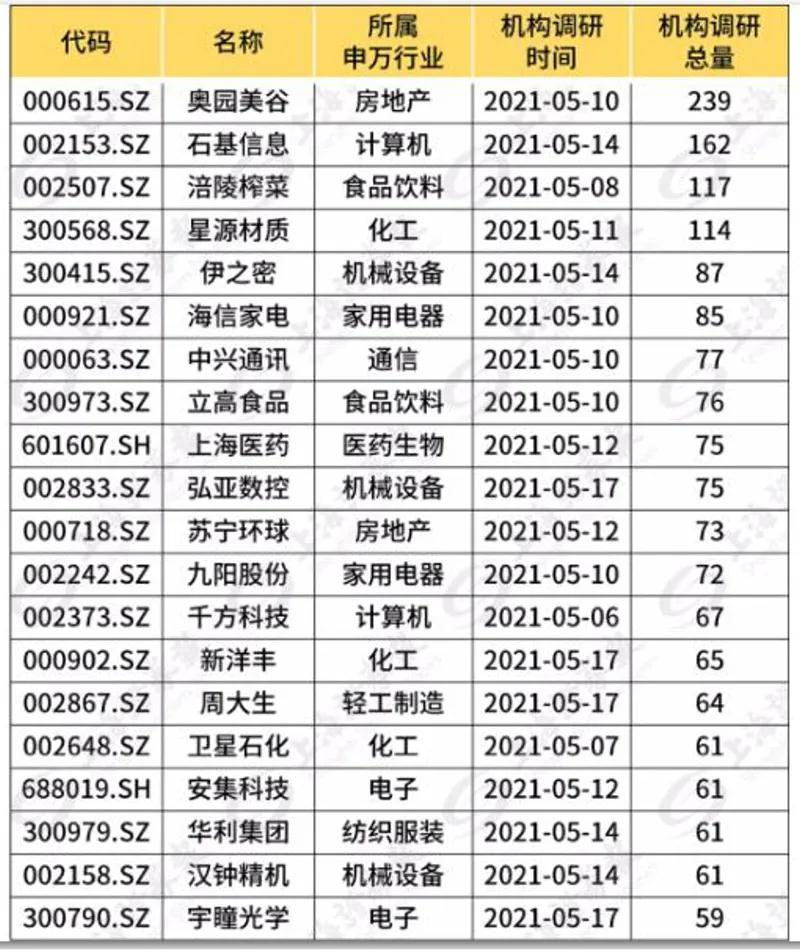数据显示,5月以来,共有337家上市公司接受了机构投资者的调研,调研的热门行业主要集中在电子、机械设备、计算机、化工、食品饮料等几大领域。从调研总量排名看,医美概念股奥园美谷成为当下最热标的。此外,石基信息、涪陵榨菜等“核心资产”也再度成为机构考察的重点。