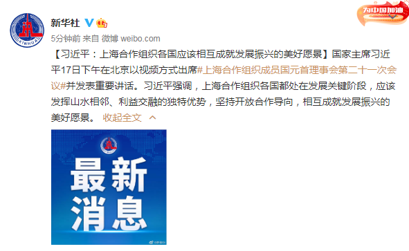 国家主席习近平17日下午在北京以视频方式出席上海合作组织成员国元首理事会第二十一次会议并发表重要讲话。习近平强调,上海合作组织各国都处在发展关键阶段,应该发挥山水相邻、利益交融的独特优势,坚持开放合作导向,相互成就发展振兴的美好愿景。