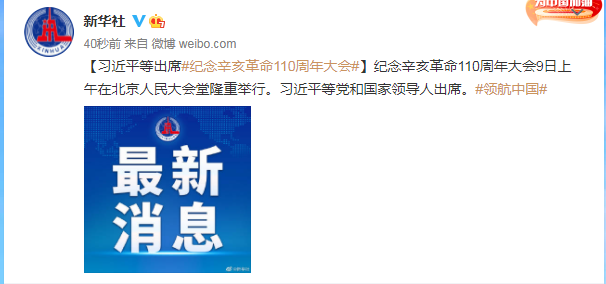 纪念辛亥革命110周年大会9日上午在北京人民大会堂隆重举行。习近平等党和国家领导人出席。