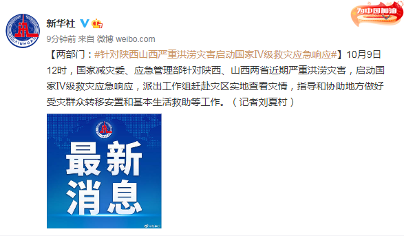 10月9日12时,国家减灾委、应急管理部针对陕西、山西两省近期严重洪涝灾害,启动国家Ⅳ级救灾应急响应,派出工作组赶赴灾区实地查看灾情,指导和协助地方做好受灾群众转移安置和基本生活救助等工作。(记者刘夏村)