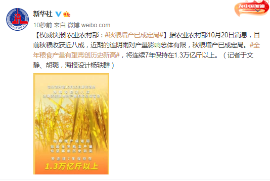 据农业农村部10月20日消息,目前秋粮收获近八成,近期的连阴雨对产量影响总体有限,秋粮增产已成定局。全年粮食产量有望再创历史新高,将连续7年保持在1.3万亿斤以上。(记者于文静、胡璐,海报设计杨轶群)