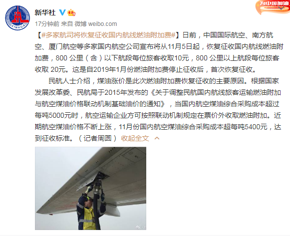 日前,中国国际航空、南方航空、厦门航空等多家国内航空公司宣布将从11月5日起,恢复征收国内航线燃油附加费,800 公里(含)以下航段每位旅客收取10元,800 公里以上航段每位旅客收取 20元。这是自2019年1月份燃油附加费停止征收后,首次恢复征收。