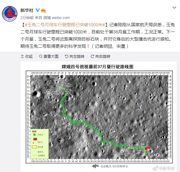 记者刚刚从国家航天局获悉,玉兔二号月球车行驶里程已突破1000米,目前处于第38月昼工作期,工况正常。下一个月昼,玉兔二号将近距离探测目标石块,并对它身后的大型撞击坑进行感知。期待玉兔二号取得更多的科学发现!(记者胡喆、宋晨)