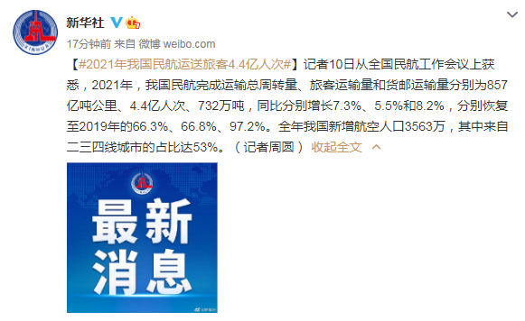 记者10日从全国民航工作会议上获悉,2021年,我国民航完成运输总周转量、旅客运输量和货邮运输量分别为857亿吨公里、4.4亿人次、732万吨,同比分别增长7.3%、5.5%和8.2%,分别恢复至2019年的66.3%、66.8%、97.2%。全年我国新增航空人口3563万,其中来自二三四线城市的占比达53%。(记者 周圆)