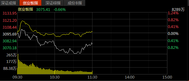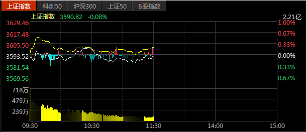 上证报中国证券网讯 1月11日早盘,三大股指均缩量震荡,沪指微跌0.08%。截至11:30,上证指数报3590.82点,下跌2.7点,下跌0.08%,成交额2653.73亿元;深证成指报14328.6点,下跌78.37点,下跌0.54%,成交额3747.1亿元,两市合计成交额6400.83亿元;创业板指报3075.41点,下跌20.28点,下跌0.66%,成交额1427.54亿元。