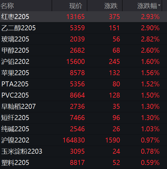 上证报中国证券网讯 截至1月14日国内期市午间收盘,红枣主力合约上涨2.93%,表现居前。此外,乙二醇、玻璃及甲醇主力合约的涨幅也都超过2%。