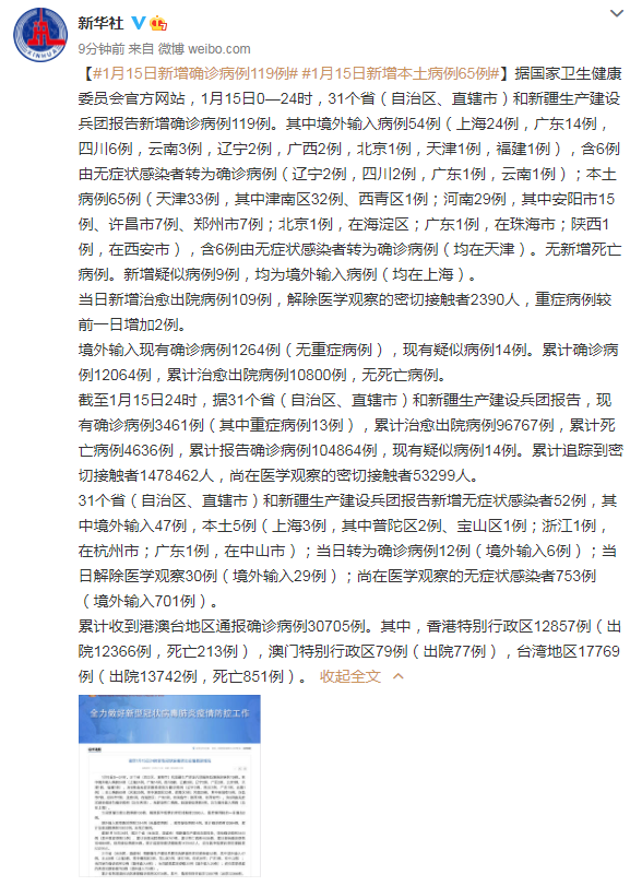 截至1月15日24时,据31个省(自治区、直辖市)和新疆生产建设兵团报告,现有确诊病例3461例(其中重症病例13例),累计治愈出院病例96767例,累计死亡病例4636例,累计报告确诊病例104864例,现有疑似病例14例。累计追踪到密切接触者1478462人,尚在医学观察的密切接触者53299人。