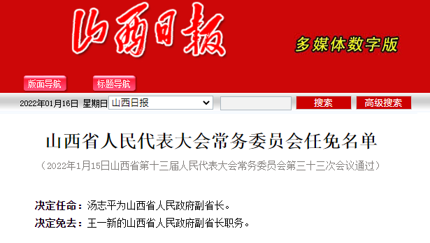 上证报中国证券网讯 据《山西日报》消息,1月15日,山西省第十三届人民代表大会常务委员会第三十三次会议通过任免名单,决定任命:汤志平为山西省人民政府副省长。决定免去:王一新的山西省人民政府副省长职务。