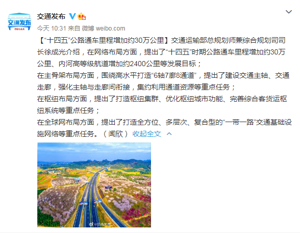 交通运输部:“十四五”公路通车里程增加约30万公里