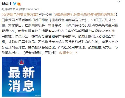 促进绿色消费实施方案对外公布 推动国家机关率先采购使用新能源汽车