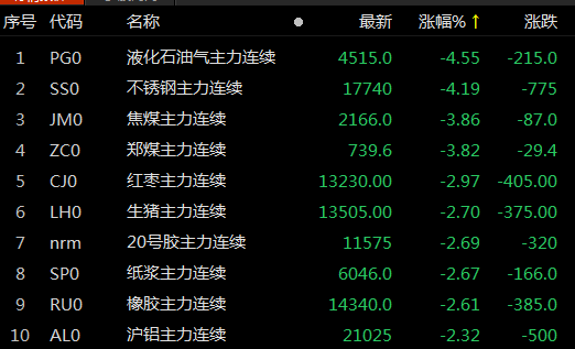 国内期市日间盘收盘液化石油气、不锈钢主力合约跌超4%