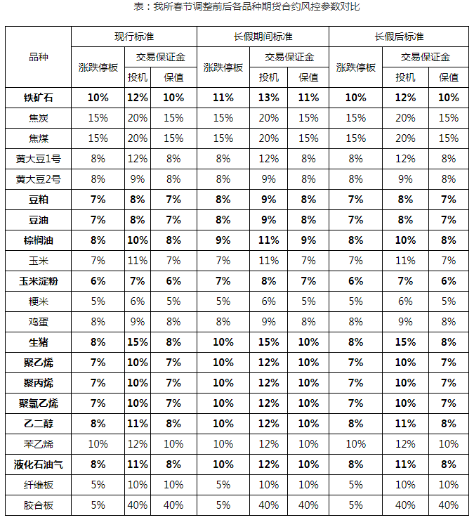铁矿石、豆粕、豆油、棕榈油、玉米淀粉、生猪、聚乙烯、聚丙烯、聚氯乙烯、乙二醇和液化石油气品种期货合约涨跌停板幅度和交易保证金水平恢复至节前标准;其他品种期货合约涨跌停板幅度和交易保证金水平维持不变。