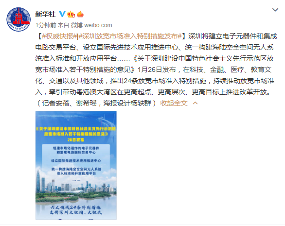 深圳将建立电子元器件和集成电路交易平台、设立国际先进技术应用推进中心、统一构建海陆空全空间无人系统准入标准和开放应用平台……《关于深圳建设中国特色社会主义先行示范区放宽市场准入若干特别措施的意见》1月26日发布,在科技、金融、医疗、教育文化、交通以及其他领域,推出24条放宽市场准入特别措施,持续推动放宽市场准入,牵引带动粤港澳大湾区在更高起点、更高层次、更高目标上推进改革开放。(记者安蓓、谢希瑶,海报设计杨轶群)