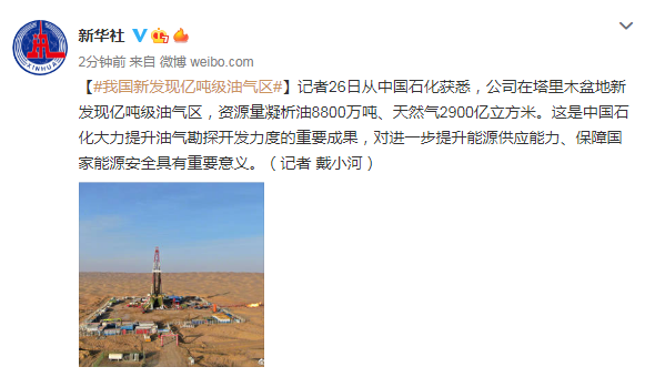 记者26日从中国石化获悉,公司在塔里木盆地新发现亿吨级油气区,资源量凝析油8800万吨、天然气2900亿立方米。这是中国石化大力提升油气勘探开发力度的重要成果,对进一步提升能源供应能力、保障国家能源安全具有重要意义。(记者 戴小河)