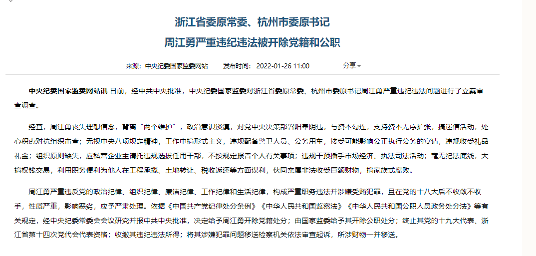 上证报中国证券网讯 据中央纪委国家监委网站1月26日消息,日前,经中共中央批准,中央纪委国家监委对浙江省委原常委、杭州市委原书记周江勇严重违纪违法问题进行了立案审查调查。