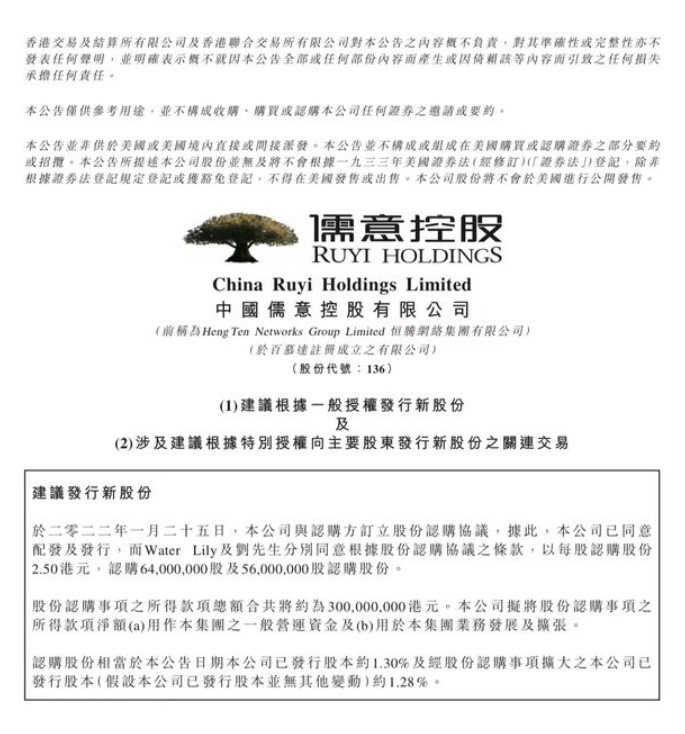 儒意控股此前名为恒腾网络,为港股上市公司。据悉,此次交易认购价每股2.5港元,较1月25日儒意控股收盘价每股2.29港元溢价约9.17%。成立于2006年的儒意影业,是国内一家在全产业链拥有行业领先的研发、制作及宣发能力,且影视双轮驱动的头部影视制作公司。此前,儒意影业先后孵化了上百部精品影视版权,投资制作了50多部极具影响力的影视剧作品。近年来推出的《你好,李焕英》《送你一朵小红花》《致青春》《北平无战事》《琅琊榜》《芈月传》等影视精品也获得了良好的市场反响。