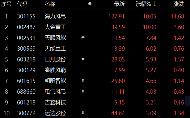 上证报中国证券网讯 1月28日,风电板块拉升,截至11:14,大金重工涨停,海力风电涨逾10%,天顺风能、天能重工、日月股份等涨超5%。