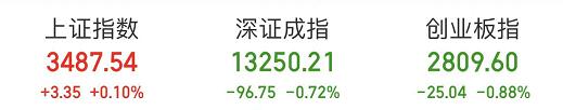 上证报中国证券网讯 3月3日早盘,三大股指高开后走势分化,沪指半日涨0.1%,创业板指盘中一度跌超1%。截至11:30,上证指数报3487.54点,上涨0.1%,成交额2731.33亿元;深证成指报13250.21点,下跌96.75点,下跌0.72%,成交额3508.24亿元,两市合计成交额6239.57亿元;创业板指报2809.6点,下跌25.04点,下跌0.88%,成交额1365.48亿元。