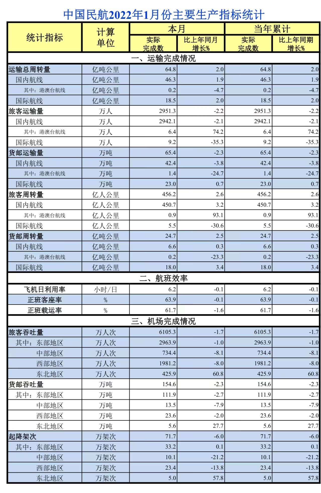 上证报中国证券网讯 中国民航局3月21日发布中国民航2022年1月份主要生产指标统计。数据显示,1月份运输总周转量为64.8亿吨公里,同比上涨2%。