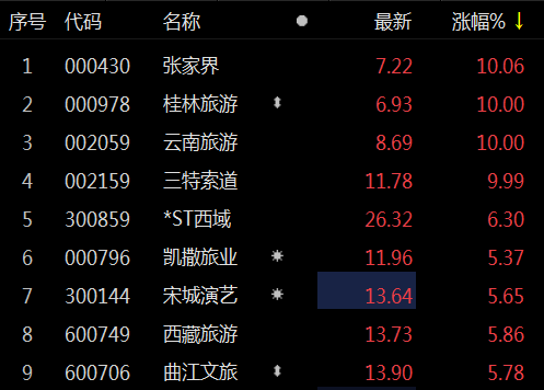 上证报中国证券网讯 4月12日,旅游板块拉升走高,截至9:37,张家界、桂林旅游、云南旅游、三特索道涨停,宋城演艺、西藏旅游等跟涨。